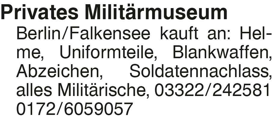 Privates Militärmuseum Be Privates Militärmuseum Berlin/Falkensee kauft an: Helme, Uniformteile, Blankwaffen, Abzeichen, Soldatennachlass, alles Militärische, 03322/242581 0172/6059057