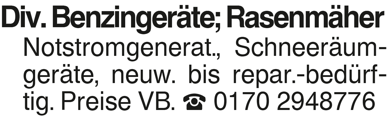 Div. Benzingeräte; Rasenm Div. Benzingeräte; Rasenmäher Notstromgenerat., Schneeräumgeräte, neuw. bis repar.-bedürftig. Preise VB. 0170 2948776Das könnte Sie auch interessieren