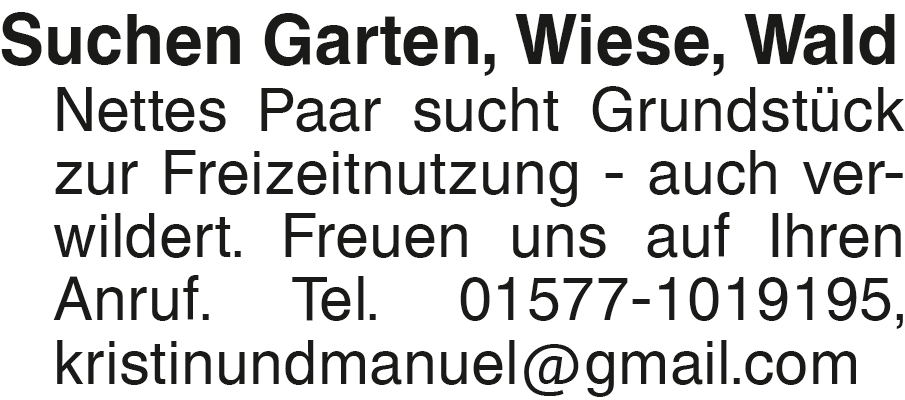 Suchen Garten, Wiese, Wal Nettes Paar sucht Grundstück zur Freizeitnutzung - auch verwildert. Freuen uns auf Ihren Anruf. Tel. 01577-1019195, kristinundmanuel@gmail.comDas könnte Sie auch interessieren