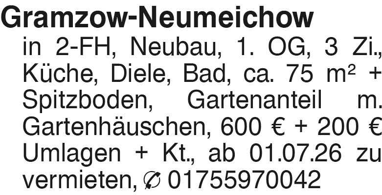 Gramzow-Neumeichow in 2-F Gramzow-Neumeichow in 2-FH, Neubau, 1. OG, 3 Zi., Küche, Diele, Bad, ca. 75 m2 + Spitzboden, Gartenanteil m. Gartenhäuschen, 600 EUR + 200 EUR Umlagen + Kt., ab 01.07.26 zu vermieten, 01755970042Das könnte Sie auch interessieren