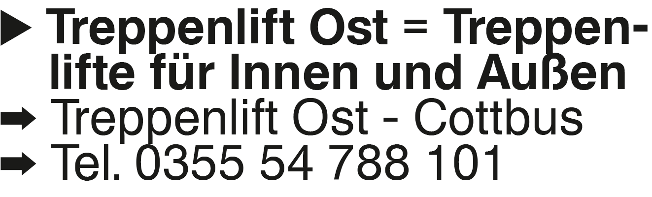 Treppenlift Ost = Treppenlifte für Treppenlift Ost = Treppen- lifte für Innen und Außen Treppenlift Ost - Cottbus Tel. 0355 54 788 101Das könnte Sie auch interessieren