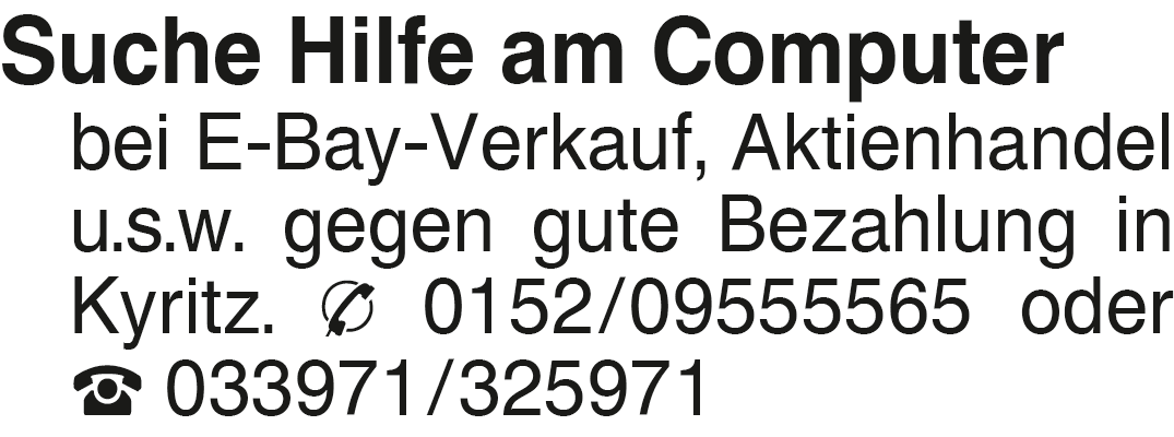 Suche Hilfe am Computer b Suche Hilfe am Computer bei E-Bay-Verkauf, Aktienhandel u.s.w. gegen gute Bezahlung in Kyritz. 0152/09555565 oder 033971/325971Das könnte Sie auch interessieren