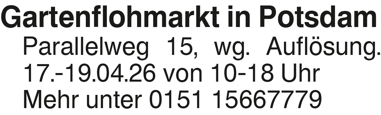 Gartenflohmarkt in Potsda Gartenflohmarkt in Potsdam Parallelweg 15, wg. Auflösung. 17.-19.04.26 von 10-18 Uhr Mehr unter 0151 15667779Das könnte Sie auch interessieren