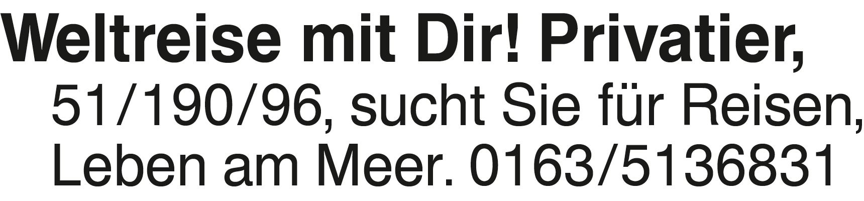 Weltreise mit Dir! Privat Weltreise mit Dir! Privatier, 51/190/96, sucht Sie für Reisen, Leben am Meer. 0163/5136831Das könnte Sie auch interessieren