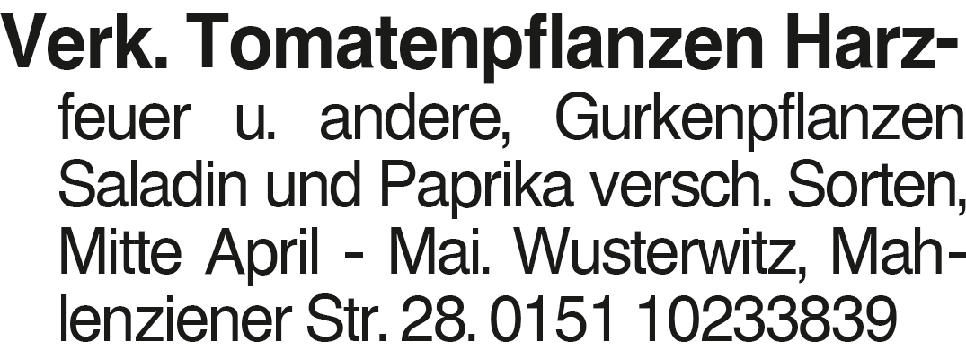 Verk. Tomatenpflanzen Har Verk. Tomatenpflanzen Harz- feuer u. andere, Gurkenpflanzen Saladin und Paprika versch. Sorten, Mitte April - Mai. Wusterwitz, Mahlenziener Str. 28. 0151 10233839