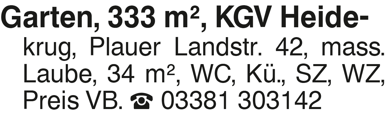 Garten, 333 m2, KGV Heide Garten, 333 m2, KGV Heide- krug, Plauer Landstr. 42, mass. Laube, 34 m2, WC, Kü., SZ, WZ, Preis VB. 03381 303142Das könnte Sie auch interessieren