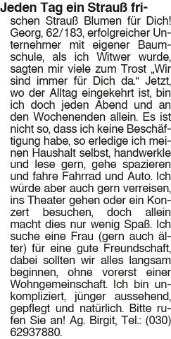 Erscheinungsdatum: Anzeige vom 18.4.2026 in der Rubrik "Er sucht Sie"