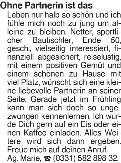 Erscheinungsdatum: Anzeige vom 18.4.2026 in der Rubrik "Ehe-/ Partnervermittlungen"