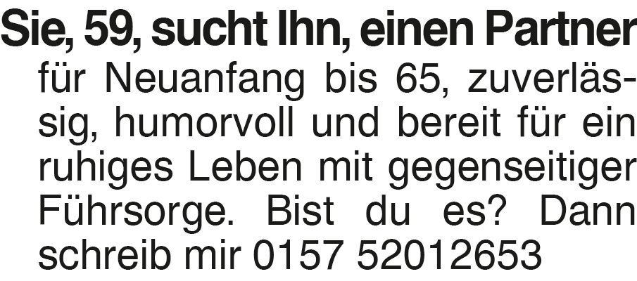 Sie, 59, sucht Ihn, einen Sie, 59, sucht Ihn, einen Partner für Neuanfang bis 65, zuverlässig, humorvoll und bereit für ein ruhiges Leben mit gegenseitiger Führsorge. Bist du es? Dann schreib mir 0157 52012653Das könnte Sie auch interessieren