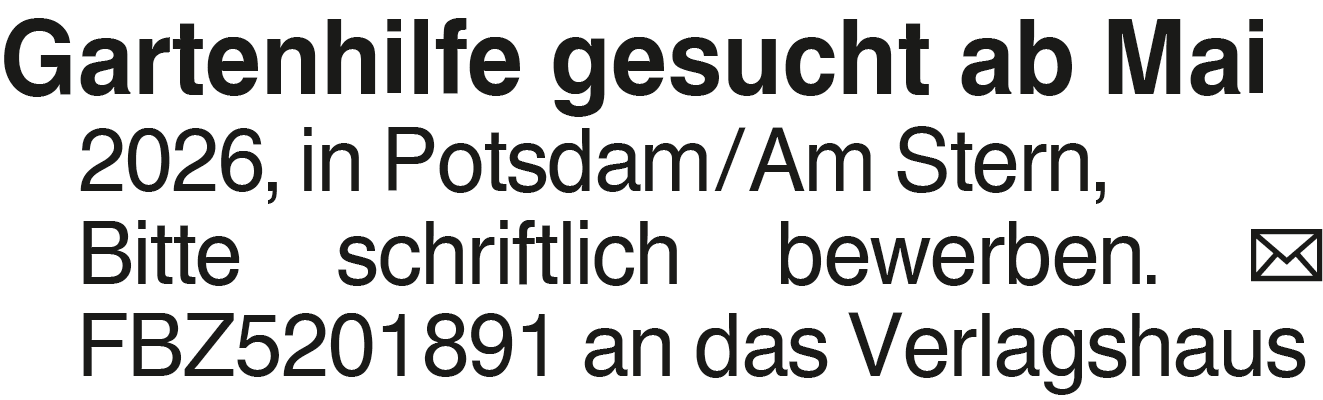 Gartenhilfe gesucht ab Ma Gartenhilfe gesucht ab Mai 2026, in Potsdam/Am Stern, Bitte schriftlich bewerben. FBZ5201891 an das VerlagshausDas könnte Sie auch interessieren