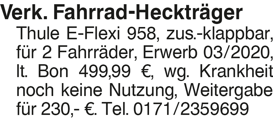 Verk. Fahrrad-Heckträger Verk. Fahrrad-Heckträger Thule E-Flexi 958, zus.-klappbar, für 2 Fahrräder, Erwerb 03/2020, lt. Bon 499,99 EUR, wg. Krankheit noch keine Nutzung, Weitergabe für 230,- EUR. Tel. 0171/2359699Kontakt