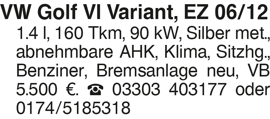 VW Golf VI Variant, EZ 06 VW Golf VI Variant, EZ 06/12 1.4 l, 160 Tkm, 90 kW, Silber met., abnehmbare AHK, Klima, Sitzhg., Benziner, Bremsanlage neu, VB 5.500 EUR. 03303 403177 oder 0174/5185318Das könnte Sie auch interessieren