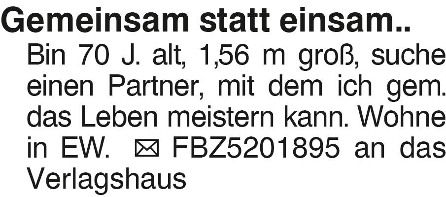 Gemeinsam statt einsam Gemeinsam statt einsam.. Bin 70 J. alt, 1,56 m groß, suche einen Partner, mit dem ich gem. das Leben meistern kann. Wohne in EW. FBZ5201895 an das VerlagshausDas könnte Sie auch interessieren