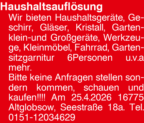 Haushaltsauflösung Wir bi Wir bieten Haushaltsgeräte, Geschirr, Gläser, Kristall, Gartenklein-und Großgeräte, Werkzeuge, Kleinmöbel, Fahrrad, Gartensitzgarnitur 6Personen u.v.a mehr. Bitte keine Anfragen stellen sondern kommen, schauen und kaufen!!!! Am 25.4.2026 16775 Altglobsow, Seestraße 18a. Tel. 0151-12034629