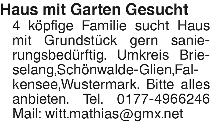 Haus mit Garten Gesucht 4 4#köpfige Familie sucht Haus mit Grundstück gern auch sanierungsbedürftig. Umkreis Brieselang, Schönwalde-Glien, Falkensee, Wustermark. Bitte alles anbieten. Tel. 0177-4966246 ab 07:00 Uhr, witt.mathias@gmx.netDas könnte Sie auch interessieren