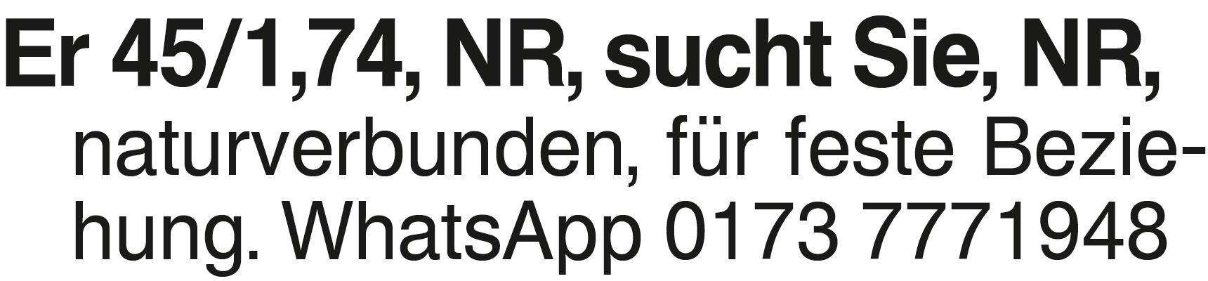 Er 45/1,74,NR,sucht Sie,N Er 45/1,74, NR, sucht Sie, NR, naturverbunden, für feste Beziehung. WhatsApp 0173 7771948Das könnte Sie auch interessieren
