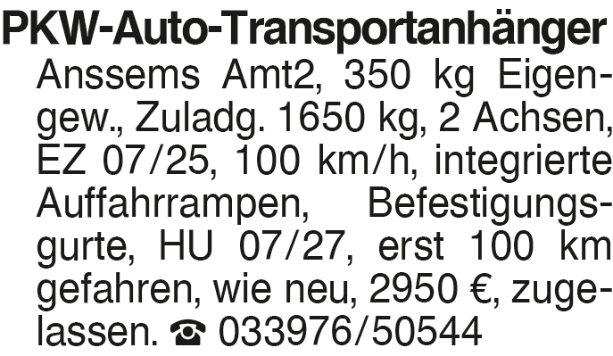PKW-Auto-Transportanhänge PKW-Auto-Transportanhänger Anssems Amt2, 350 kg Eigengew., Zuladg. 1650 kg, 2 Achsen, EZ 07/25, 100 km/h, integrierte Auffahrrampen, Befestigungsgurte, HU 07/27, erst 100 km gefahren, wie neu, 2950 EUR, zugelassen. 033976/50544Das könnte Sie auch interessieren
