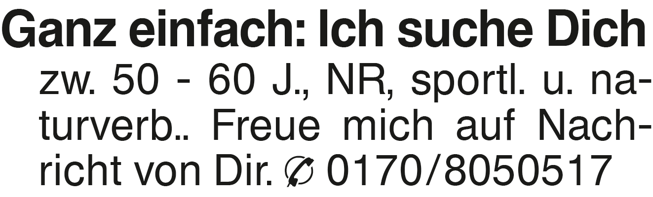 Ganz einfach: Ich suche D Ganz einfach: Ich suche Dich zw. 50 - 60 J., NR, sportl. u. naturverb.. Freue mich auf Nachricht von Dir. 0170/8050517Das könnte Sie auch interessieren