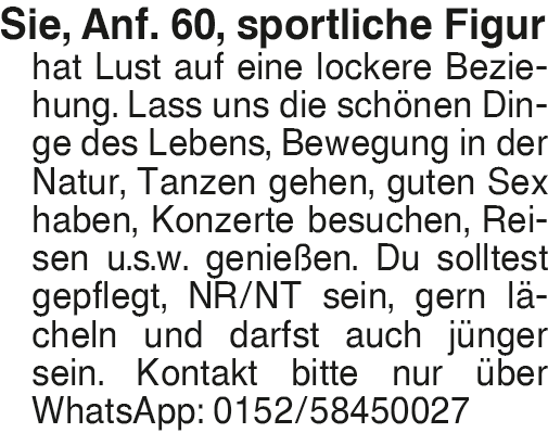 Sie, Anf. 60, sportliche Sie, Anf. 60, sportliche Figur hat Lust auf eine lockere Beziehung. Lass uns die schönen Dinge des Lebens, Bewegung in der Natur, Tanzen gehen, guten Sex haben, Konzerte besuchen, Reisen u.s.w. genießen. Du solltest gepflegt, NR/NT sein, gern lächeln und darfst auch jünger sein. Kontakt bitte nur über WhatsApp: 0152/58450027Das könnte Sie auch interessieren