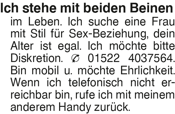 Ich stehe mit beiden Bein Ich stehe mit beiden Beinen im Leben. Ich suche eine Frau mit Stil für Sex-Beziehung, dein Alter ist egal. Ich möchte bitte Diskretion. 01522 4037564. Bin mobil u. möchte Ehrlichkeit. Wenn ich telefonisch nicht erreichbar bin, rufe ich mit meinem anderem Handy zurück.Das könnte Sie auch interessieren