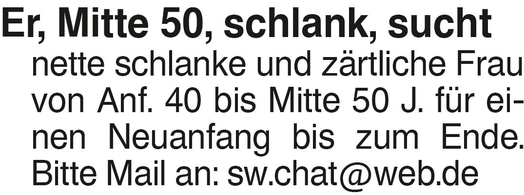 Er, Mitte 50, schlank, su Er, Mitte 50, schlank, sucht nette schlanke und zärtliche Frau von Anf. 40 bis Mitte 50 J. für einen Neuanfang bis zum Ende. Bitte Mail an: sw.chat@web.de