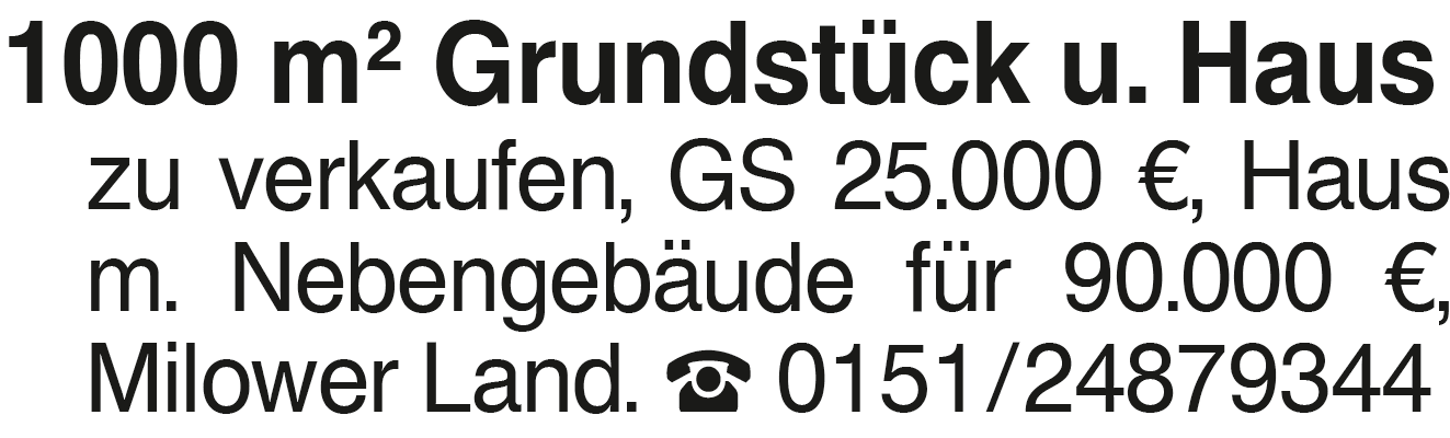 1000 m2 Grundstück zu ver 1000 m2 Grundstück u. Haus zu verkaufen, GS 25.000 EUR, Haus m. Nebengebäude für 90.000 EUR, Milower Land. 0151/24879344Kontakt