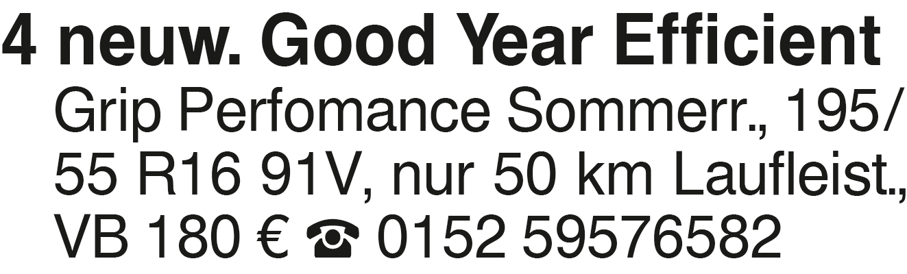 4 neuw. Good Year Efficie 4 neuw. Good Year Efficient Grip Perfomance Sommerr., 195/55 R16 91V, nur 50 km Laufleist., VB 180 EUR 0152 59576582Das könnte Sie auch interessieren