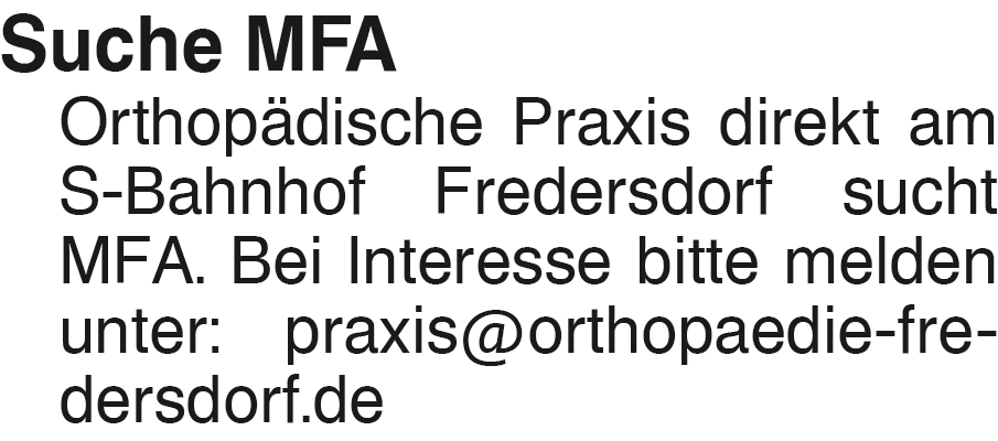 Suche MFA Orthopädische P Orthopädische Praxis direkt am S-Bahnhof Fredersdorf sucht MFA. Bei Interesse bitte melden unter: praxis@orthopaedie-fredersdorf.de praxis@orthopaedie-fredersdorf.deKontakt